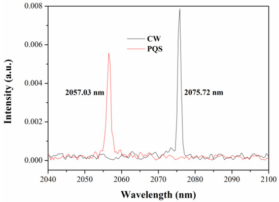 A 721A IR laser wavelength meter with a measuring range of 1300–5000 nm (Bristol Instruments Inc., Victor, NY, USA) was used to obtain an output wavelength of Tm,Ho:LuVO4 laser in CW and PQS modes operations (Figure 6). An output wavelength of 2075.72 nm was achieved in the CW mode operation, and 2057.03 nm was achieved in the PQS mode operation.