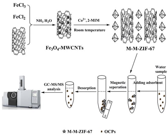 Schematic illustration of the synthetic route to prepare zeolitic imidazolate framework based on magnetic multiwalled carbon nanotubes and the magnetic solid-phase extraction steps for organochlorine pesticides analysis.