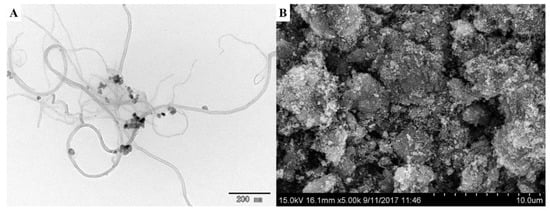 The micro-morphologies of the Fe3O4–MWCNTs and M-M-ZIF-67 were observed by SEM and TEM. As shown in Figure 2A, the Fe3O4 nanoparticles are attached to the MWCNT surface. The SEM image of M-M-ZIF-67 in Figure 2B shows that the composite has a rough surface, indicating that the material has good potential as an adsorbent [27].