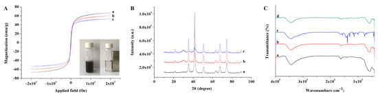 (A) magnetic hysteresis loops for (a) Fe3O4; (b) magnetic multiwalled carbon nanotubes; and c) zeolitic imidazolate framework based on magnetic multiwalled carbon nanotubes. The insert shows magnetic separation and dispersion of zeolitic imidazolate framework based on magnetic multiwalled carbon nanotubes; (B) X-ray diffraction patterns of (a) Fe3O4; (b) magnetic multiwalled carbon nanotubes; and c) zeolitic imidazolate framework based on magnetic multiwalled carbon nanotubes; (C) Fourier-transform infrared spectra of (a) Fe3O4; (b) magnetic multiwalled carbon nanotubes; (c) zeolitic imidazolate framework-67; and (d) zeolitic imidazolate framework based on magnetic multiwalled carbon nanotubes.