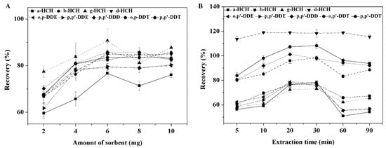 The present study aims to achieve satisfactory extraction performance for analytes in water samples. The effect of the amount of M-M-ZIF-67 on extraction was investigated using different amounts of the sorbent ranging from 2 to 10 mg. The experimental results (Figure 4A) show that the extraction recoveries of the OCPs rapidly increase when the amount of M-M-ZIF-67 is increased from 2 to 6 mg, and the recoveries then slightly decrease when the amount of sorbent is increased from 6 to 10 mg. Based on these results, 6 mg of M-M-ZIF-67 was chosen for the following experiments.