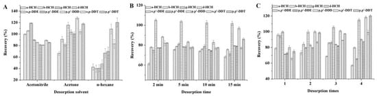 To investigate the effect of the frequency of desorption, ultrasonic desorption of the nine OCPs was performed one to four times using 2 mL of the desorption solvent and a desorption time of 5 min. The results are shown in Figure 5C. The optimum recoveries are obtained when the analytes are eluted two times. Thus, the frequency of desorption was set to two for the following experiments.
