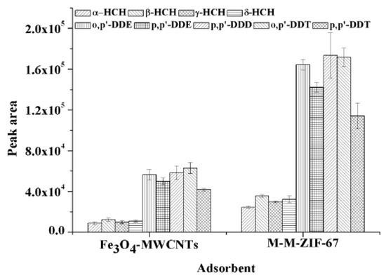 Effect of the sorbent on the adsorption capacities for the nine organochlorine pesticides. Extraction conditions: sample volume, 5 mL; amount of sorbent, 6 mg zeolitic imidazolate framework based on magnetic multiwalled carbon nanotubes and 4 mg magnetic multiwalled carbon nanotubes; and extraction time, 20 min. Desorption conditions: 2 mL of acetonitrile; ultrasonication time, 5 min, and ultrasonication performed one more time. The error bars show the standard deviation of the mean (n = 3).