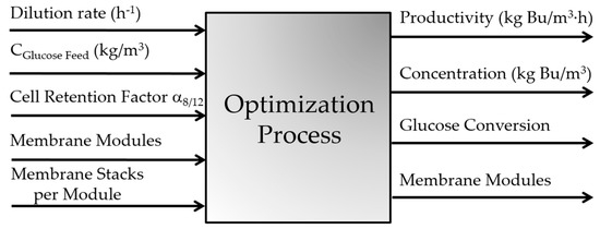 For the continuous integrated fermentation process, pervaporation is an attractive separation method that can be used to continuously recover butanol from the ABE fermentation broth [8]. Pervaporation is a membrane-based separation process of binary or multicomponent liquid mixtures, and, as its name implies, it involves permeation through a dense hydrophobic membrane and evaporation on the permeate side. The permeating vapor is then recovered by condensation. Polydimethylsiloxane (PDMS) membrane is regarded as a promising candidate for butanol separation, as it exhibits high and stable performance in butanol recovery from ABE solvents via pervaporation [9]. The continuous integrated fermentation-membrane pervaporation process that was optimized in this work is presented schematically in Figure 1. This process mainly consists of a continuous fermenter, a microfiltration unit, and a membrane pervaporation system. For a set of input operating conditions of the overall process, the dynamic mass balance of each individual component of the process is solved with time until a steady state is achieved. The main input variables of the process, i.e., the decision variables in the optimization problem, are the fermenter dilution rate, the inlet sugar concentration, the cell retention factor, and the membrane area of the pervaporation unit as dictated by the number of membrane modules and the number of membrane stacks per module. Mass balances for the main species of the fermentation broth, namely acetone, acetic acid, butanol, butyric acid, ethanol, microorganism, glucose, and water, were considered in this work. The detailed set of mass balances and process equations can be found in [10].