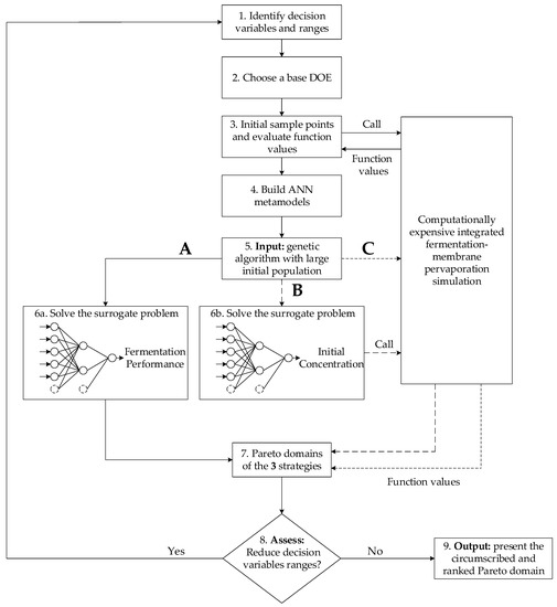 The Pareto domain can now be obtained using three different routes. First, the genetic algorithm can be used along with the four ANNs of the four objective functions. Second, the genetic algorithm can use the original integrated ABE fermentation model with the eight ANNs predicting the initial species concentrations within the fermentation broth, and finally, with the original integrated ABE fermentation model with arbitrary initial species concentrations. Figure 4 depicts these three strategies, referred to as A, B and C, respectively. Steps 1–4 in Figure 4 describe the method for the derivation of the ANNs, discussed previously. In steps 5–7, the genetic algorithm branches to strategy A, B, or C to circumscribe the Pareto domain of the integrated ABE fermentation process, consisting in this investigation of 5000 solutions. The performance of the two ANN metamodels is assessed (Step 8) based on the obtained Pareto domains. To be as inclusive as possible, the initial ranges of the five decision variables may have been chosen using a larger range than the ones corresponding to the obtained Pareto domain. To get a more accurate Pareto domain, it is then possible to perform an additional iteration of the optimization process using metamodels obtained with reduced ranges of the decision variables. When a converged Pareto domain is obtained, the optimal solution is determined using the NetFlow method and then validated using the actual model of the process (step 9).