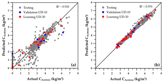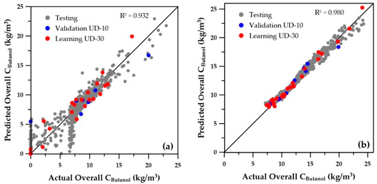 Results of the ANN predictions of the species concentrations are presented first. The parity plot giving the predicted versus actual values for the concentrations of butanol is presented in Figure 5. Very similar results were obtained for the concentrations of the other seven species, so their graphs are not shown. In this graph, points represented by red, blue, and gray symbols correspond to the training (30 solutions), validation (10 solutions), and testing (1000 solutions) data, respectively. The testing data was generated by randomly choosing the five decision variables subjected to the same minimum and maximum bounds of the training and validation datasets. The graph on the left of Figure 5 presents the predictions obtained by the ANNs when the decision variables for training and validation were selected using a wider range (Table 1). Results show that the predicted concentrations have a high degree of scatter, especially at the lower concentrations. The residuals are heteroskedastic for the initial range, as the variance of the error is not constant, and two sections with distinct variability prevail in Figure 5a. There are many solutions with zero concentrations in the actual fermenter, corresponding to operating conditions where the microorganisms were washed out, i.e., the culture was not able to sustain itself through the fermenter due to high dilution rates and high cell retention factor α8/12.