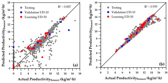 Predicted versus actual butanol productivity for (a) initial ranges and (b) reduced ranges of the five decision variables.