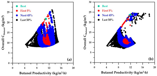 Figure 8a depicts the overall concentration of butanol as a function of butanol productivity, as determined by the genetic algorithm using the four ANN metamodels. The best-ranked solution is located at a butanol productivity of 10.95 kg/m3∙h and an overall butanol concentration of 21.74 kg/m3 (Table 3, column A). When the decision variables associated with the optimal solution obtained with the ANN were used in the phenomenological simulator to validate this optimal point, values of 12.14 kg/m3∙h and 24.04 kg/m3 were obtained, respectively. This is comparable to the best-ranked solution obtained by the genetic algorithm using the phenomenological simulator, as depicted in Figure 8b, where butanol productivity of 11.83 kg/m3∙ was obtained (Table 3, column C). Figure 8 shows the positive correlation between butanol productivity and overall butanol concentration at a constant dilution rate. The dilution rate increases diagonally (left to right) from a lower bound of 0.5 h−1 to an upper bound of 1.4 h−1. The empty portion depicted in the Pareto domain of Figure 8b corresponds to an inoperable range due to the constraints that exist between elevated dilution rate, butanol concentration, and flow rates to achieve steady state. The metamodel failed to recognize these limitations and instead filled the empty region accordingly by interpolating the data. This observation is expected, as a metamodel is based on input–output observations without accounting for the intrinsic constraints of the system. Nevertheless, the best-ranked solution and the solutions ranked in the first 5% were well identified with the metamodels.