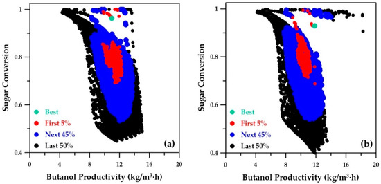Plots of sugar conversion versus butanol productivity for the integrated fermentation–membrane pervaporation system: (a) ANN metamodels; (b) actual integrated system simulation.