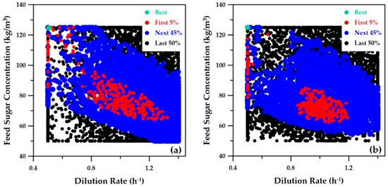 The first two decision variables, the dilution rate and the feed sugar concentration, are plotted in Figure 11. Both strategies led to very similar graphs. The best-ranked solution shows that the optimal trade-off was obtained for a feed sugar concentration of 125 kg/m3 and a dilution rate of 0.5 h−1 for both strategies. The third decision variable, the cell retention factor, was kept constant at 0.1. A small value of the cell retention factor implies that a higher microorganism concentration prevails inside the fermenter. The optimal operating conditions as determined with the Pareto domains obtained with the three strategies described in Figure 4 are summarized in Table 3. The two sub-columns of Table 3 for strategy A correspond to the first three objectives predicted with the five decision variables by the ANN metamodel and the phenomenological simulator, respectively. The latter is recorded for validation purposes.