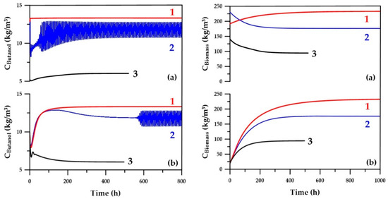 Butanol and biomass concentration as a function of time with (a) initial concentrations predicted by ANNs and (b) arbitrary initial concentrations. (1) Best ranked solution; (2) medium-ranked solution; (3) lowest-ranked solution.