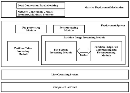 The proposed system architecture consists of computer hardware, live OS, deployment system, and massive deployment mechanism (refer to Figure 1). Four modules are included in the system architecture: (1) partition table processing; (2) partition image processing; (3) pre-processing; and, (4) post-processing modules. Two sub-modules exist in the second partition image processing module: file system process module and partition image file compressing and decompressing module. The massive deployment mechanism can support either local or network connections. The former one enables the connections of massive disks to the system buses, such as the USB or the external Serial Advanced Technology Attachment (eSATA) bus. The latter one (i.e., network connection mechanism) is for massive machines connected to network switches.