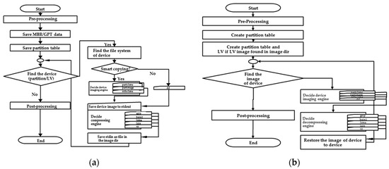 In this example, partclone.ntfs is the program that was developed in this research, while the programs pigz and split are the existing programs from the Linux system. The procedures for saving an image from a drive and restoring the image to another drive are shown in Figure 2a,b, respectively. Figure 2a shows the imaging engines for a different file system, which includes Partclone, Partimag, ntfsclone, and dd. Among them, Partclone is the default engine for Clonezilla. In addition, the sequential compressing programs from the Linux system, which include gzip, bzip2, lzma, lzip, or xz, could be used to compress the image. By default, gzip is chosen. If the CPU on the system has multiple cores, the corresponding parallel program, like pigz, pbzip2, plzip, or pixz, can be used when such a program is available from the Linux system. However, if the corresponding program is unavailable, then Clonezilla will roll back to use the sequential program. As an image is restored, the image should be decompressed by the corresponding program and then written to a partition, according to the format of the image, as described in Figure 2b.