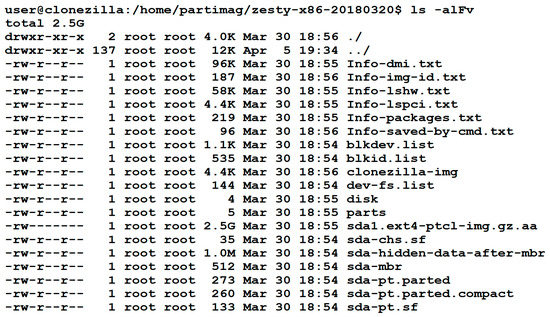 A screenshot about the image directory from Clonezilla is presented in Figure 3. One can easily identify the file(s) by reading its name. For example, sda-mbr is the MBR data of disk sda, where sda is the device name under Linux for the first hard drive in the system. Meanwhile, sda1.ext4-ptcl-img.gz.aa is the image of sda1 being saved by the imaging program Partclone. Here, sda1 is the first partition on the first drive. After being compressed by the gzip or pigz program, the image file is split into several volumes. The default limit of each volume is 4 Giga Byte (GB). Because the image size of the example is only 2.5 GB, and there is only one volume, then the suffix is aa. If more volumes exist in the image, the suffixes ab, ac, etc., will be used, respectively. The complete list of the file formats supported is provided in Table 1. The names denoted in brackets are assigned according to the name of the device (disk, partition, or Logical Volume Manager (LVM)), file system, compression format, or suffix. The other names without brackets are fixed styles.