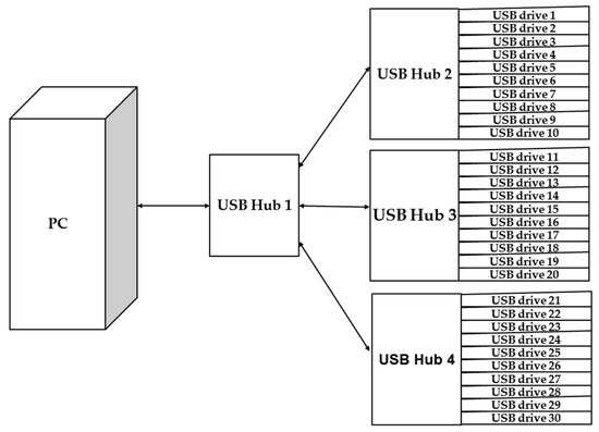 The main USB hub was plugged into the USB port of the PC. Three other USB hubs were connected to the main USB hub, as demonstrated in Figure 4.