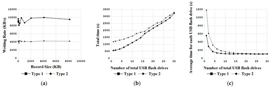 Before the mass deployment of USB flash drives was started, an understanding of the writing rates for the two types of flash drives is essential. Therefore, the benchmarking program, the IOzone [47], was used to evaluate the writing rate between the two configurations, Types 1 and 2. Type 1 consists of 32 GB USB 3.0 flash drives. Type 2 consists of 16 GB USB 2.0 flash drives. The evaluation results are demonstrated in Figure 5a. According to the evaluation results, the performance of Type 1 is about two times that of the performance of Type 2. Figure 5b,c further demonstrate the performance of writing an image to various numbers of USB flash drives 1, 2, …, 30 USB flash drives, respectively. While the number of USB flash drive(s) is small, e.g., 1, 2, …, 10, the deploy time to Type 2 USB flash drive(s) is about two times the deploy time to a single Type 1 USB flash drive (refer to Figure 5b,c). However, the discrepancies between the deploy time to both Types 1 and 2 USB flash drives approaches zero when the number of USB flash drives approaches 30. All of the USB flash drives being deployed have been verified as bootable and can successfully enter the Ubuntu Linux on the test machines. Therefore, the feasibility for the massive deployment of disks in a single computer by the proposed architecture has also been verified.
