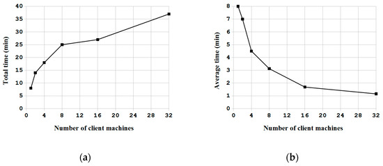 In the beginning, an image was taken from a template machine that was installed with an Ubuntu Linux system. The size of the blocks that were being used on the disk was 50 GB, and the Linux system was saved as an image of 34 GB by Clonezilla live using pigz. The image was put in the local hard drive belonging to the server. The server was booted with the ‘to ram’ option in the Clonezilla live boot menu, and the local hard drive was mounted so that the image that was saved from the template machine can be read. After that, the server entered the lite-server mode, which relays the DHCP requests from the PC clients to the existing DHCP service in the LAN. After choosing the image, the multicast mode is then assigned. The client machines were booted from the PXE. Six tests were conducted, i.e., deploying the image to 1, 2, 4, 8, 16 and 32 clients. Figure 7 demonstrates the results of the massive deployment. Figure 7a,b illustrate the total time and the average time to massively deploy the image, respectively. Based on the illustrations, the average time to deploy a machine is mainly reduced by using the multicast mechanism in the massive deployment. All of the client machines were verified as bootable and could enter the Ubuntu Linux. Hence, the second experiment verified the feasibility of massive deployment in large-scale computers.