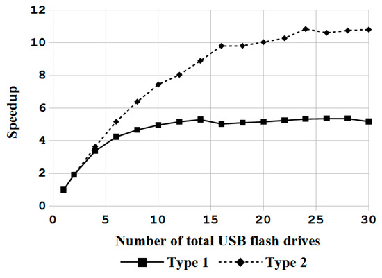 Therefore, from Equation (3), is the key factor to judge the speedup for massive deployment by using the local connection. In theory, the maximum transfer rate of the USB 2.0 is 480 Mb/s. From Figure 5a, the average writing rates for Types 1 and 2 flash drives were 9.2 MB/s and 4.1 MB/s, respectively. For the two types of USB flash drives, the ratio of the bandwidth to the writing rate is demonstrated in Table 3. For the Type 1 flash drives, when the number of drives was less than 4, the speedup increased almost linearly. When the number of drives was more than 6, the speedup increased more slowly. When the number of drives was more than 10, the speedups were almost the same, which was about 5. For Type 2 flash drives, when the number of drives was less than 10, the speedup increased almost linearly. When the number of drives was more than 16, the speedup is almost the same, which was about 10 to 11. The number of the total USB flash drives versus the speedup for each configuration is illustrated in Figure 8. Due to the overhead during the system deployment, including the USB bus constraints, the time to create the partition table, and the time to install the boot loader on the flash drives, the theoretic ratio of bandwidth to the writing rate being demonstrated in Table 3 cannot match the experimental values in Figure 8 exactly when checking Equation (3). Nevertheless, the trend matches well between the theory and experiments, since for both Types 1 and 2, when the number of drives being deployed “n” is smaller than , the speedup values that were obtained in the experiments increased almost linearly. Conversely, the speedup values obtained in the experiments became almost the same, which are roughly the value of when the number of drives being deployed “n” is larger than .