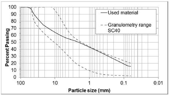 The soil comes from a borrow pit in the milestone 16 + 400 of the C-627 road, in the province of Burgos (Spain). Figure 3 shows the granulometry of the material according to the Spanish Association for Standardization and Certification (AENOR) [] and the granulometry range for the soil-cement with a maximum aggregate size of 40 mm, designed as SC40, according to the Spanish regulations on soil-cement []. The material has not plasticity [] and the sand equivalent test gives a value of 20 []. The material can be classified as SP-SM following the unified soil classification system (USCS) []. The soil has no organic material [] or soluble sulphate []. The maximum aggregate size is limited to 40 mm.