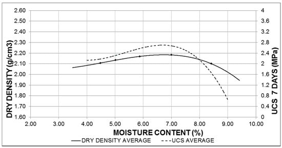 Additionally, Table 7 shows the results of the UCS test [] carried out on the parts obtained after performing the four-beam test, the dry density, the percentage of modified Proctor density, and, for each couple of parts from the same specimen, the average UCS.