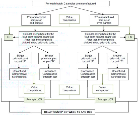 The heterogeneity of the material leads to the appearence of small differences in the manufactured batches. Flexural strength (FS) tests at 90 days, with the four-point flexural beam test, are conducted for each of the 20 samples produced with the 10 batches. Additionally, UCS tests are applied to each of the parts in which the specimen previously tested is divided. These tests (FS at 90 days and UCS at 90 days) allow for checking of the homogeneity of the compaction process for both samples made in the same batch, as long as the differences between modified Proctor densities of those samples from the same batch is below 3%. Furthermore, it also allows for checking of the homogeneity of the compaction procedure in the specimen itself, observing if both parts, obtained after FS test, have similar compressive strength.