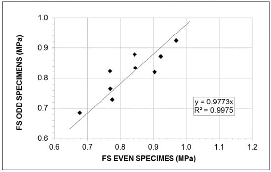 Figure 6 represents the relationships between FS values in odd and even samples of the same batch, modeled by a simple linear regression forced to go through the origin (without intercept). Table 6 shows a direct relationship between the long-term FS of the odd and even specimens of the same batch. Since the p-value of the t-test of the estimation of the slope is lower than 0.05, the hypothesis of null slope can be refused with 95% significance, which would imply that there is no relationship between specimens from the same batch.