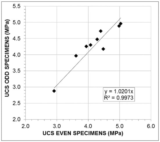 As observed in Table 9, the p-value of the estimator of the slope indicates the existence of a direct and statistically significant relationship, with a 95% confidence level, for the long-term UCS between specimens from the same batch. The slope value shows that the even part has a greater UCS than the odd one.