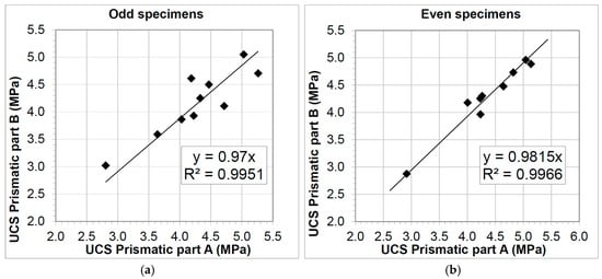Relationships between UCS of prismatic parts from the same specimen: (a) odd specimens; (b) even specimens.