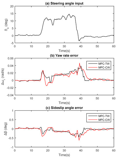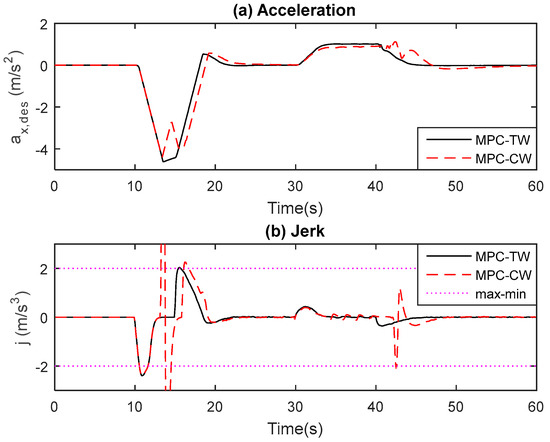 Figure 10, the MPC-TW can take an immediate brake as a result of tunable weights and also avoid overshooting to some extent, accordingly improving the longitudinal ride comfort. Furthermore, during the steering maneuver, the tracking capability of MPC-CW (from 30 s or so in
