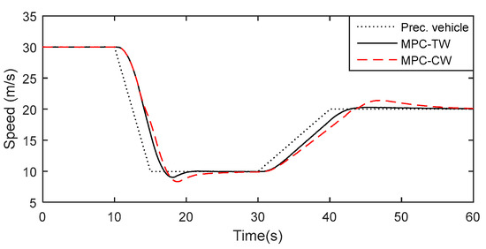 Figure 9, one can see that the MPC-CW cannot provide a substantial braking force in time when the preceding vehicle decelerates emergently at 10 s, and accordingly the inter-vehicle distance becomes shorter than that of MPC-TW. As shown in
