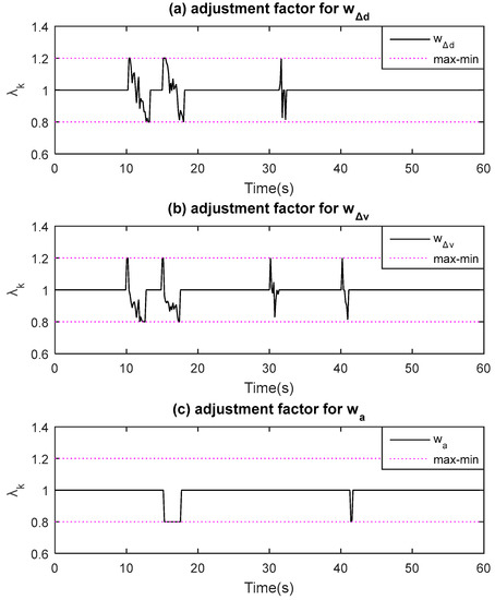 Figure 11 shows the adjustment factor of the weight coefficient based on the self-tuning strategy suggested as Equation (27). Under the emergent scenario (from 10 s to 20 s or so), the weight of the desired acceleration, as well as the speed error, decreases because the corresponding adjustment factor shifts to less than 1, which indicates that the penalty for