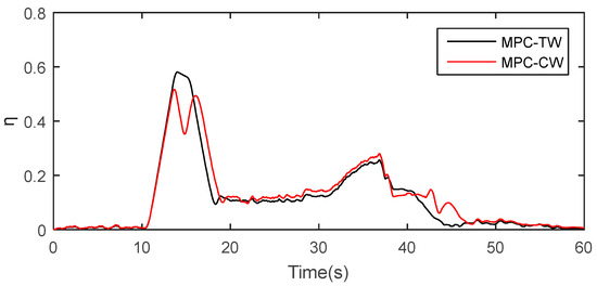 Figure 12, the peak values for MPC-TW and MPC-CW are about 59% and 52%, respectively, accordingly guaranteeing another hard constraint, shown as Equation (22). Dangerous situations, such as spin or drift, always happen when the adhesion workload tends to its peak [