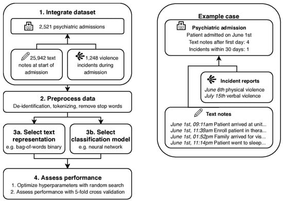 Violence from patients directed at staff or other patients is seen in almost any psychiatric treatment facility. Iozzino [33] reports the prevalence of a violence incident happening during admission in 35 different facilities, which lies between 2% and 44%, averaging 17% over these different sites. Individual patient factors that are associated with violence risk, such as a history of substance abuse and a history of violent behavior are well described (e.g., [34,35,36,37,38]). Meta analyses, however, reveal that only a small amount of these factors is found to be robust when comparing the results of various studies on different populations [39,40]. The task of predicting the occurrence of violence incidents has been shown to be even more challenging, especially when no structured instruments are used [41]. Psychiatrists in training for example do not perform much better than random at this task with an Area Under Curve (AUC) of the Receiver Operator Curve of 0.52, while using a structured instrument improves the performance (AUC = 0.67) to the level of a trained psychiatrist (AUC = 0.71) [42]. A substantial proportion of health care professionals therefore makes use of risk assessment instruments [43], of which the Violence Risk Appraisal Guide [44], Structured Assessment of Violence Risk in Youth [45], and Historical Clinical Risk Management-20 [46] are most commonly used [47]. A meta study by Sing et al. [48] reports that the median predictive performance of these three instruments falls in a relatively narrow range between 0.70 and 0.74 AUC, showing that prediction of violence incidents is possible with moderately good results. There is however also a large variation in performance of these instruments over different sites [49]. It seems that the heterogeneity of psychiatric patient populations inhibits straightforward generalization of measuring instruments’ predictive performance to other treatment facilities. This has caused serious discussion, and sometimes even skepticism on the usability of these instruments in practice [50,51]. Given that these instruments are furthermore considered to be time-consuming and thus expensive [52], predicting violence incidents from clinical text that is already registered could be considered an important contribution to the field of personalized medicine [53]. In this work we therefore apply several machine learning techniques to this problem, in order to determine if prediction of violence incidents from EHR data is possible, and if so what Deep Learning or classical techniques should be applied.