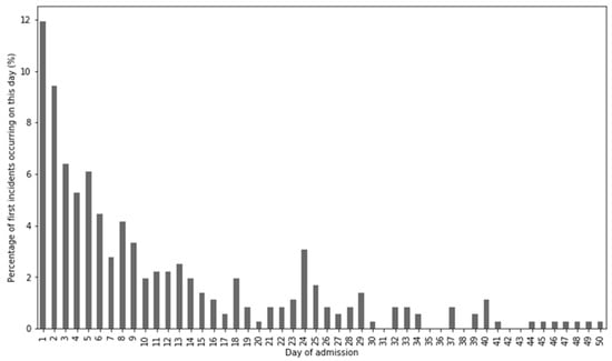 Day on which the first violence incident occurred as percentage of the total number of first incidents, cutoff after day 50. For instance, it can be verified that if violence occurs during an admission, the first incident happened on the fifth day of admission roughly 6% percent of the time.