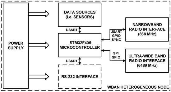 Both radio interfaces work in accordance with the IEEE 802.15.4 standard, including the operating frequencies in the Wireless Medical Telemetry Service (WMTS) and UWB bands for Europe, which is indicated as possible for use in WBANs [19].