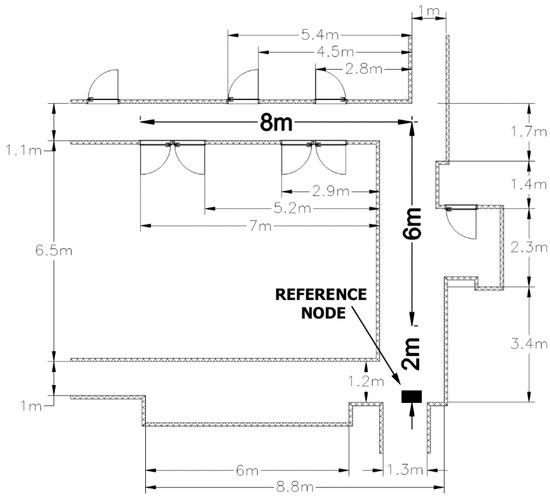 The measurements were carried out for two dynamic scenarios (SCNs): approaching to (APR), and departing from (DEP), the RN. These two scenarios correspond to a typical human behavior in indoor environments, and they are widely considered in WBAN research. They allow for the analysis of the measurement data independently of the side of the body on which the node is located, i.e., regardless of the antenna’s placement on the left or right wrist. For the DEP scenario, the user started the motion at the distance of 2 m from the RN with the line-of-sight (LOS) conditions and walked towards the end point through the L-shaped corridor. After 6.5 m along the walking path there is a change between the zone with LOS conditions and the zone behind the corridor’s corner with non-LOS (NLOS) conditions. The walk ended after travelling a distance of 14 m. In Figure 3, a floor plan of the investigated environment, which is a part of the passenger ferryboat’s seventh deck, is shown.