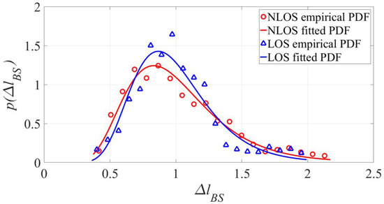 In Figure 4, some examples of the lognormal probability density functions (PDFs) fitted to the empirical fading distribution for one of the measurement scenarios in NB channel were presented. The goodness-of-fit (GoF) metrics, i.e., the correlation coefficient (r) and the chi-square () test were also evaluated. The correlation coefficient should be higher than the adopted acceptability threshold . The threshold value for the chi-square test, i.e., for the significance level α = 0.05, is for Rayleigh distribution, and for the others.
