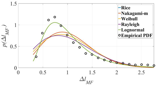 In Figure 5, the exemplary results of the selected PDFs fitted to the empirical distribution of multipath fading is shown. Rice- and Rayleigh-fitted PDFs’ distribution parameters were similar. This may be caused by the fact that, in a strong multipath environment like the investigated one, there is no dominant direct component, and the received signal is a sum of a large number of reflected components. Apparent asymmetry of the empirical distribution around the mean value makes the lognormal distribution the best fitting one. Apart from the subjective assessment, the GoF test has been performed using the correlation coefficient and the chi-square test.