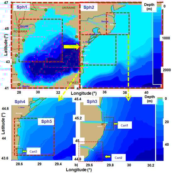 The computational domains defined in spherical coordinates: (a) Sph1—Black Sea basin and Sph2 (right side)—western coastal driver; (b) Sph3—nearshore area at the mouths of the Danube River (right side); Sph4 and Sph5 (left side)—Southern RO1 and RO2. The positions of the three Cartesian domains are also indicated.