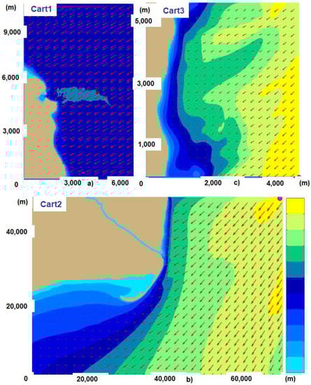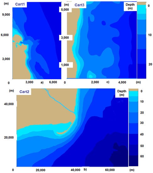 The computational domains defined in Cartesian: (a) Cart1—the nearshore in front of Sulina arm of the Danube River; (b) Cart2—Sacalin Peninsula and the Saint George arm of the Danube River; (c) coastal environment close to Mangalia city, the south of the Romanian nearshore.