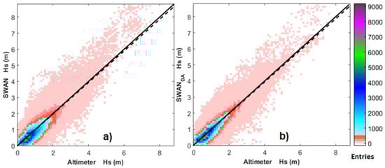 Hs scatter diagrams: a) SWAN without DA and b) SWAN with DA (right), results corresponding to the 15-year time interval 1999–2013.