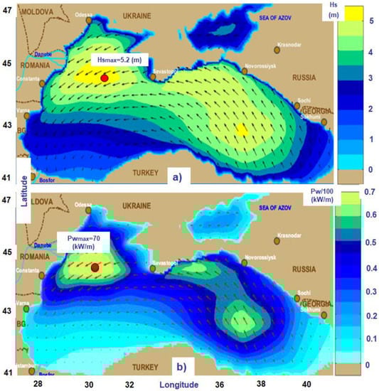 From this perspective, Figure 4 illustrates high wave conditions in the entire basin of the Black Sea (computational domain Sph1). These model results correspond to the time frame 8 January 2017. Figure 4a presents the significant wave height scalar fields (Hs) and the wave vectors and Figure 4b the wave power scalar fields (Pw) and the energy transport vectors. The maximum values of the significant wave height and wave power are also indicated, they are: Hsmax = 5.2 m and Pwmax = 70 kW/m. These correspond to two different locations offshore the Danube Delta, which are very close. At this point, it has to be highlighted that the case study presented in Figure 4 corresponds to one of the most common patterns concerning the spatial distribution of the wave energy in the basin of the Black Sea. According to this pattern, the tendency of the wave energy is to concentrate in the western part of the basin in the Black Sea. This is also related to the characteristics of the atmospheric circulation, according to which the strongest winds blowing over the Black Sea are usually from the northeast.