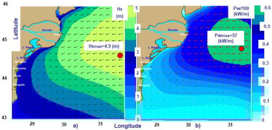 High wave conditions in the Black Sea (computational domain Sph1), model results corresponding to the time frame 8 January 2017. (a) Significant wave height scalar fields and wave vectors (represented by black arrows); (b) wave power scalar fields and energy transport vectors (represented by red arrows). The maximum values of the significant wave height and wave power are also indicated.