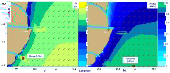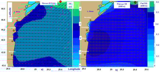 Regarding now level 3, Figure 6 presents high wave conditions at the mouths of the Danube River (computational domain Sph3). The model results correspond to the time frame 22 March 2017. Figure 6a illustrates the significant wave height scalar fields and wave vectors while Figure 6b the wave power scalar fields and energy transport vectors. The maximum values of the significant wave height and wave power are Hsmax = 5.2 m and Pwmax = 58 kW/m. Although they are both located in the southern side of the domain, their positions are different this time. Thus, the significant wave height has the highest value at the mouth of the Saint George arm while the point with the maximum wave power is located about 0.35 degrees offshore, close to the southern boundary of the SWAN domain. The next two areas defined for this level (L3) are illustrated in Figure 7 and Figure 8 and they correspond to the computational domains Sph4—Southern RO1 and Sph5—Southern RO2, respectively. Thus, Figure 7 presents the model results for the time frame 7 October 2017 and Figure 8 those for the time frame 25 October 2017. The maximum values of the significant wave height and wave power are Hsmax = 4.0 m and Pwmax = 58 kW/m, for the case presented in Figure 7 and Hsmax = 4.9 m and Pwmax = 76 kW/m, for the case presented in Figure 8. In both cases the significant wave height and wave power have the maximum values in the same point, which is located in the northeastern side of the SWAN computational domain.