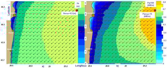 High wave conditions in the southern side of the Romanian nearshore (computational domain Sph5—Southern RO2), model results corresponding to the time frame 25 October 2017. (a) Significant wave height scalar fields and wave vectors (represented by black arrows); (b) wave power scalar fields and energy transport vectors (represented by red arrows).