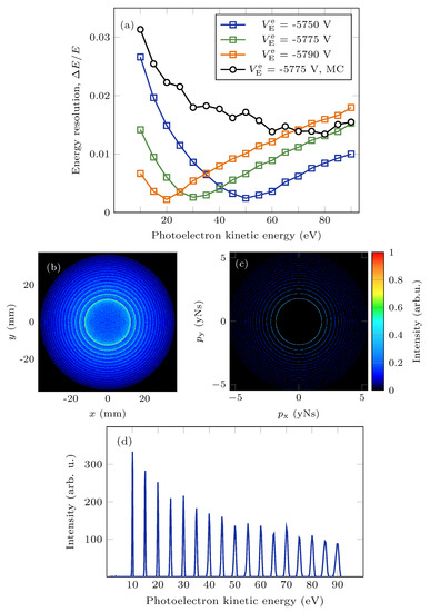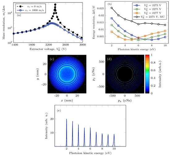 Figure 3a shows the resulting energy resolution for electron VMI for three different settings for the extractor voltage, , calculated using the 27-particle model (blue, green and orange lines). The optimum extractor voltage, for which the best resolution was achieved for a photoelectron energy of 30 eV, was found to be kV (), and for this setting, the resulting energy resolution from the Monte Carlo simulation is shown (black line), indicating an energy resolution better than for photoelectron energies between 30 and 85 eV. In Figure 3b,c, the corresponding simulated detector image and the 3D momentum distribution after inversion are shown, respectively. Figure 3d shows the photoelectron energy spectrum calculated from the 3D momentum distribution.