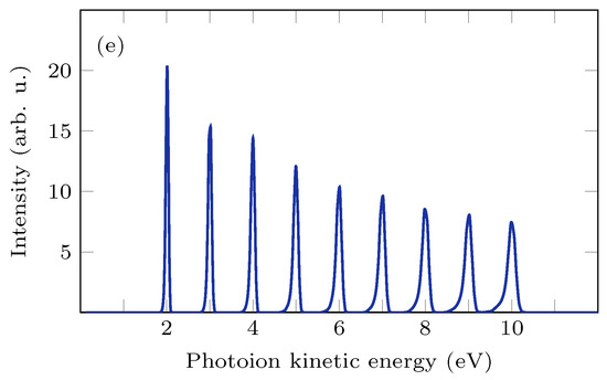 Figure 2b shows the resulting energy resolution for ion VMI in Operation Mode 1(b) for three different settings for the extractor voltage, , calculated using the 27-particle model (blue, green and orange lines). The optimum extractor voltage, for which the best resolution was achieved for a photoion kinetic energy of 6 eV, was found to be kV (), and for this setting, the resulting energy resolution from the Monte Carlo simulation is shown (black line), indicating an energy resolution better than for kinetic energies between 6 and 10 eV. In Figure 2c,d, the corresponding simulated detector image and the 3D momentum distribution after inversion are shown, respectively. Figure 2e shows the kinetic energy spectrum calculated from the 3D momentum distribution.