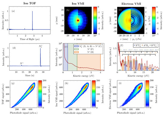 Figure 6b shows the photoion momentum distribution of all the ionic fragments that were generated in the interaction region, averaged over 25,000 shots. The anisotropy of the distribution, peaked in the vertical direction, is due to the fact that the cross-section for excitation to the dissociative states is higher for molecules aligned along the laser polarization direction. The faint horizontal ripple pattern in the images is a result of ions scattering on the mesh in the repeller electrode. In Figure 6e, the corresponding photoion kinetic energy is displayed. It reveals three main features: a peaked contribution shaded in blue, a broader feature shaded in green and another broad contribution almost spreading out to the edge of the detector shaded in orange. We attribute the strongest feature (shaded blue) to low kinetic energy N ions and predissociation of the N C state [51]. The contribution shaded in green has previously been assigned to dissociation from the F state, and the features in the area shaded in orange are associated with dissociation from the highly-excited Rydberg-like states of N and the H band [51,52,53].