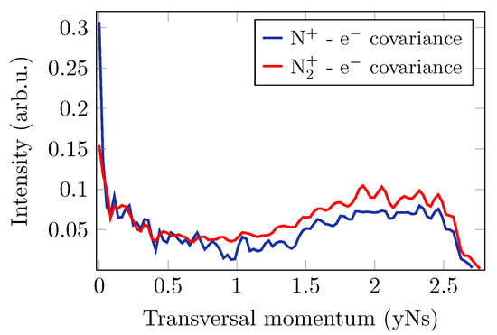 Results of ion-electron covariance analysis. Covariance between the photoelectron transversal momentum spectrum and the ion-TOF channels of N (blue) and N (red). Qualitatively, the N channel shows stronger correlation with low momentum photoelectrons, whereas the N channel exhibits a stronger correlation with photoelectrons at higher transversal momenta.
