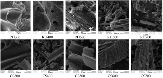 Scanning electron microscopy (SEM) images of the biochar materials obtained from rice husk (RH) and cotton straw (CS) at various pyrolysis temperatures (300, 400, 500, 600, and 700 °C).